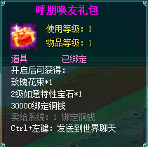 呼朋唤友礼包:玫瑰花束*1、2级如意特性宝石*1、30000铜钱。被绑定好友可获得。每绑定一个老玩家可获得一个。可重复获得,最多可被10个老玩家绑定。