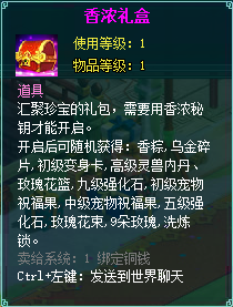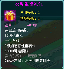 久别重逢礼包:玫瑰花束*1、三生石*1、2级如意特性宝石*1、30000铜钱。老玩家可领取,每天可领取1个。