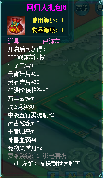回归大礼包6:铜钱*80000、绑定元宝*50、云霄碎片*10、灵石碎片*30、60进阶保护符*3、万年玄铁*3、洗炼锁*30、高级五行聚魂瓶*2、远古残魂*10、神兽血滴*4、宠物资质丹*2。
