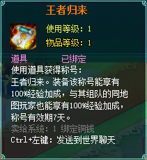 活动期间内,玩家只要与带有“王者归来”称号的玩家一起在同一个地图打怪将获得额外100%经验加成,此处经验加成与经验丹、世界等级、封印加成叠加。