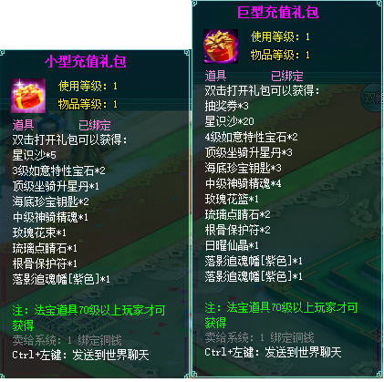 2、充值礼包中的法宝道具均为70级以上玩家才能获得。