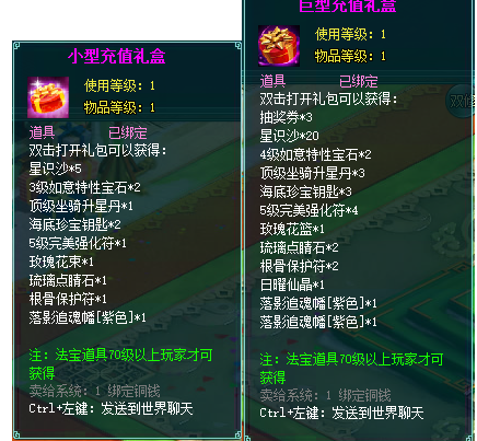 2、充值礼盒中的法宝道具均为70级以上玩家才能获得。