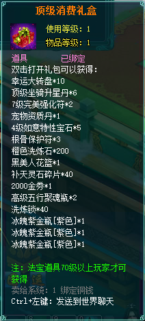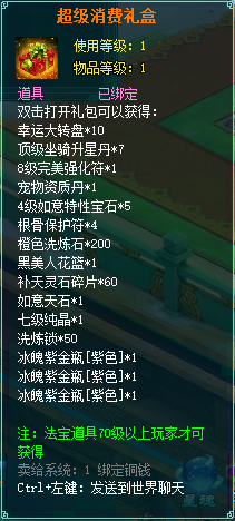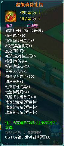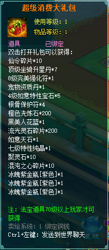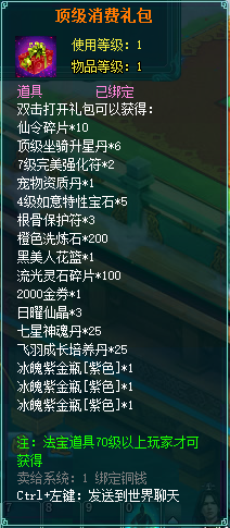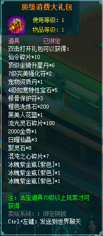 1、消费礼包中的法宝道具等级70级以上玩家才可获得。