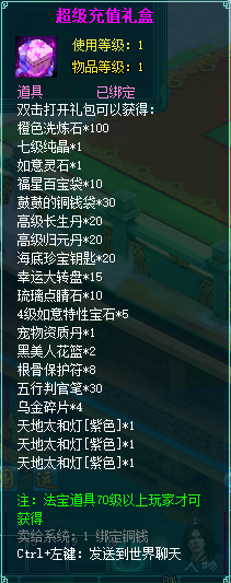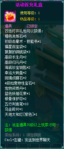 2、充值礼盒中的法宝道具均为70级以上玩家才能获得。