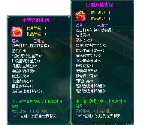 2、充值礼盒中的法宝道具均为70级以上玩家才能获得。