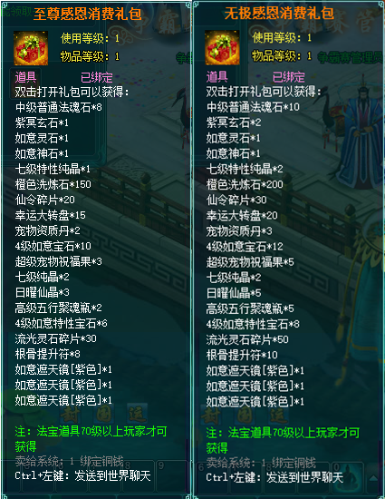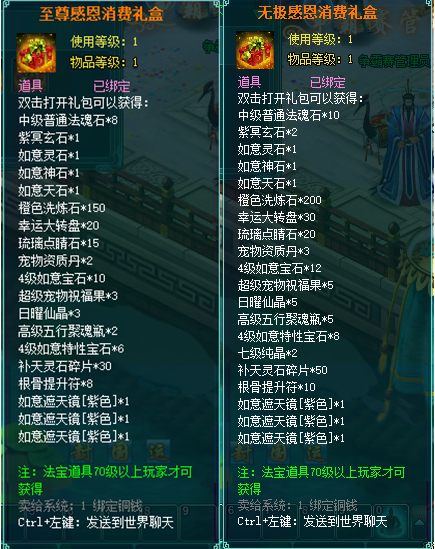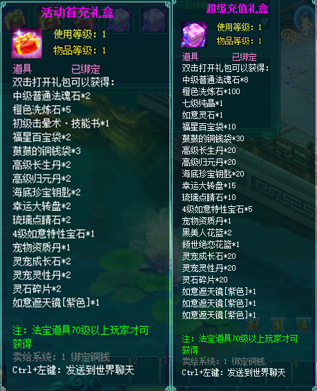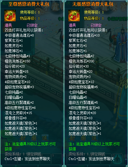 2、充值礼盒中的法宝道具均为70级以上玩家才能获得。