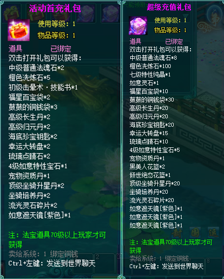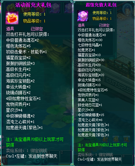 2、充值礼包中的法宝道具均为70级以上玩家才能获得。