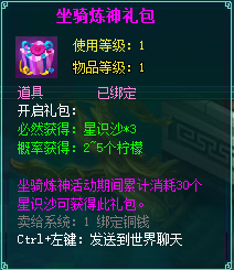坐骑炼神礼包:打开获得坐骑星识沙*3,有概率获得2~5个柠檬