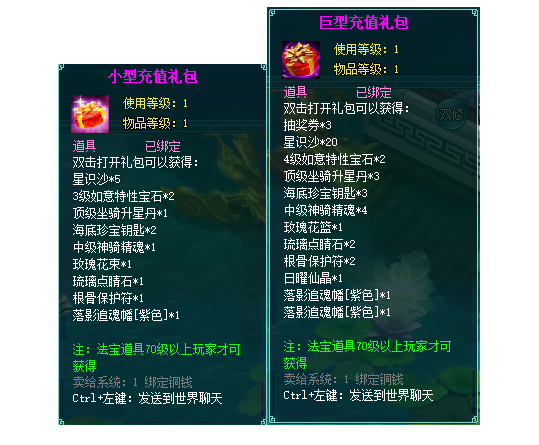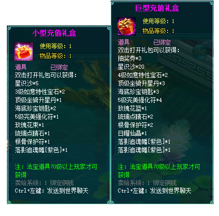 2、充值礼盒中的法宝道具均为70级以上玩家才能获得。