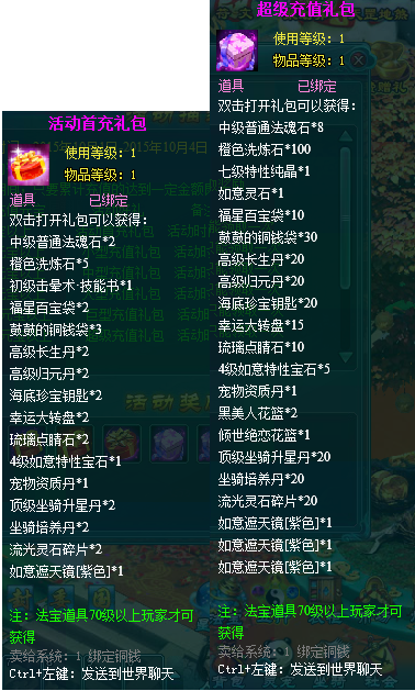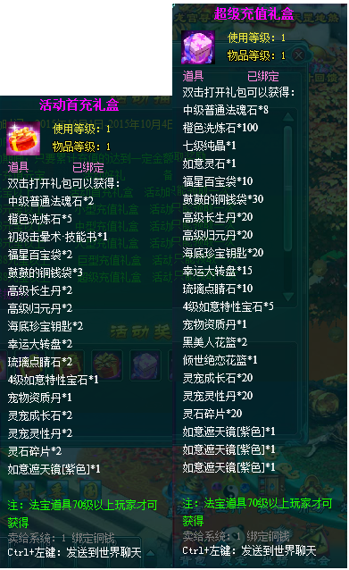 2.充值礼包中的法宝道具均为70级以上玩家才能获得。