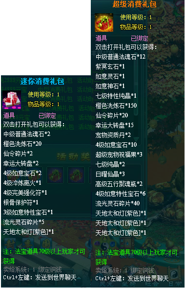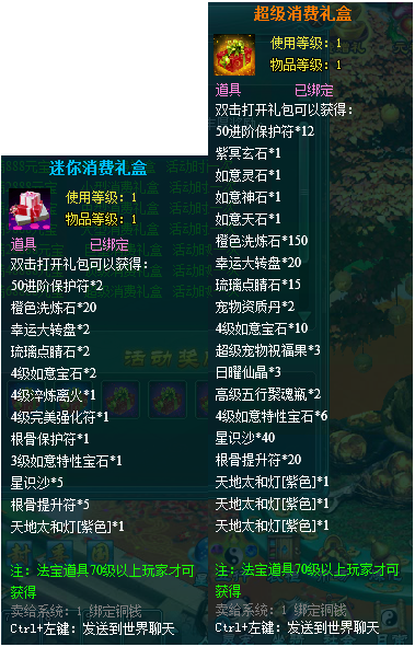 1,消费礼包中的法宝道具等级70级以上玩家才可获得。