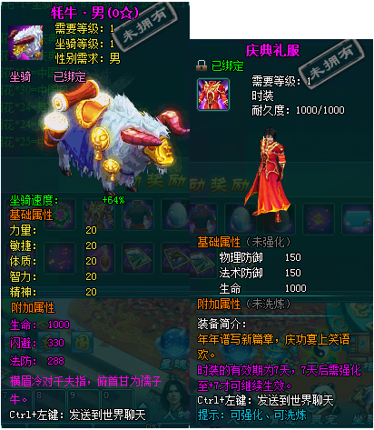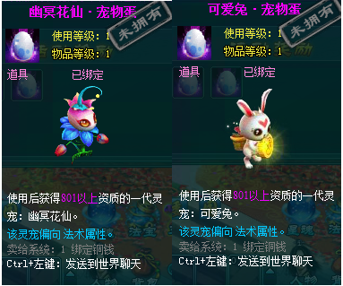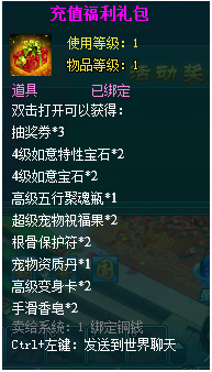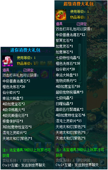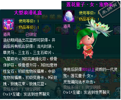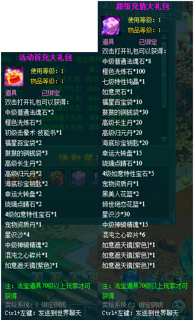 1、以上礼包中的物品除了宠物蛋外,其他全为绑定不可交易。