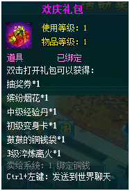 2,欢庆礼包中的物品均为绑定道具,不可交易。