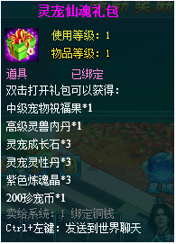 2,灵宠仙魂礼包:开启后获得:中级宠物祝福果*1、高级灵兽内丹*1、灵宠成长石*3、灵宠灵性丹*3、紫色炼魂晶*3、200珍宠币*1