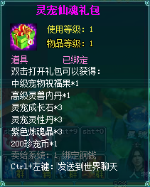 2、灵宠仙魂礼包:开启后获得:中级宠物祝福果*1、高级灵兽内丹*1、灵宠成长石*3、灵宠灵性丹*3、紫色炼魂晶*3、200珍宠币*1
