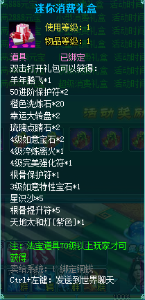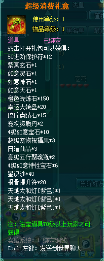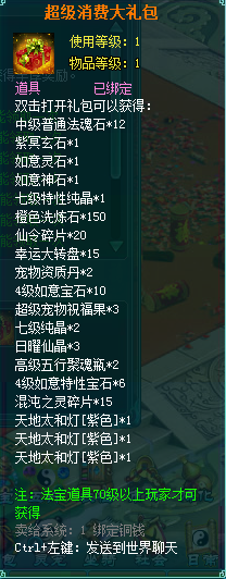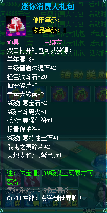 1、消费礼包中的法宝道具等级70级以上玩家才可获得。