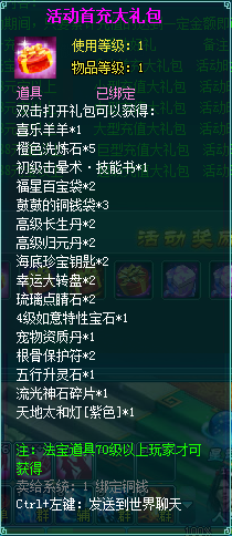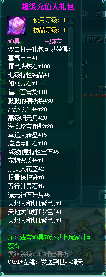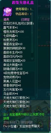 1、充值礼包中的法宝道具均为70级以上玩家才能获得。