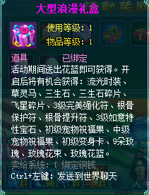 1、在活动期间内,每次送出花篮、花束都会获得额外的礼盒奖励,打开礼盒将还有机会获得草灵马坐骑、三生石、流光时装等珍贵道具。