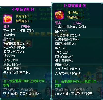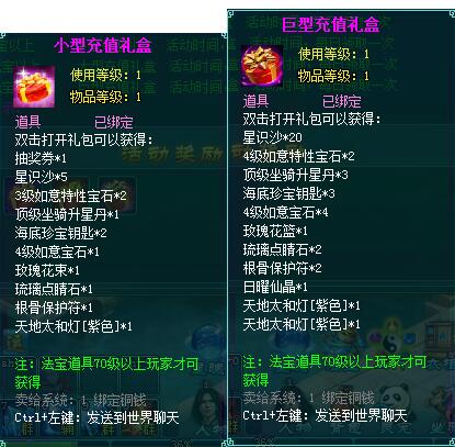 2、充值礼盒中的法宝道具均为70级以上玩家才能获得。