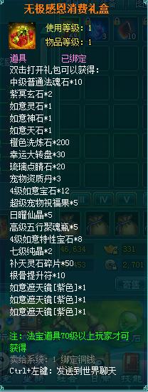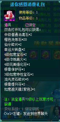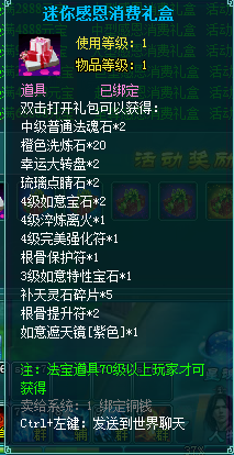 1、消费礼盒中的法宝道具等级70级以上玩家才可获得。