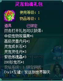 2、灵宠仙魂礼包:开启后获得:中级宠物祝福果*1、高级灵兽内丹*1、灵宠成长石*3、灵宠灵性丹*3、紫色炼魂晶*3、200珍宠币*1
