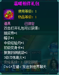 1、温暖相伴礼包中包含:抽奖券*1、帽子*1、中级经验丹*1、初级变身卡*1、鼓鼓的铜钱袋*1、3级淬炼离火。