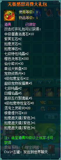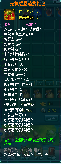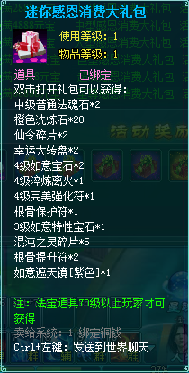 1、消费礼包中的法宝道具等级70级以上玩家才可获得。