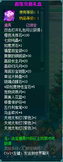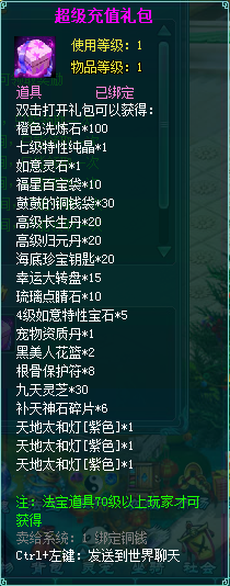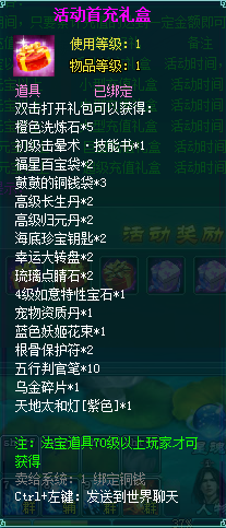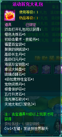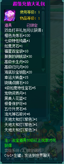 1、充值礼包中的法宝道具均为70级以上玩家才能获得。