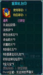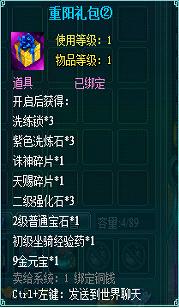1、 50级以下的玩家活动重阳礼包①,50级以上的玩家获得重阳礼包②;