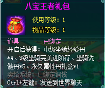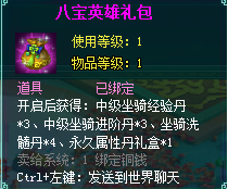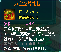 内含:4级如意特性石*1、超级宠物祝福果*1、根骨保护符*5、桃花瓣*3、蓬莱珍宝钥匙*2、中级坐骑进阶丹*8、黑美人花篮*1、落影追魂幡[紫色]*2。(注:法宝道具70级以上玩家才可获得)