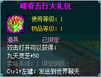 | 充值任意元宝 | 暖春充值礼包 | 活动时间,只能领取一次 |