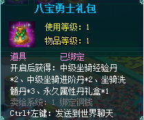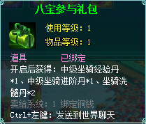 内含:根骨保护符*1、仙桃*1、桃花瓣*1、中级坐骑进阶丹*2、海底珍宝钥匙*1、黑美人花束*1、落影追魂幡[蓝色]*1。(注:法宝道具70级以上玩家才可获得)