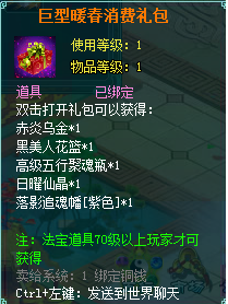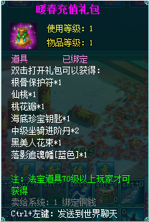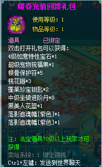 1,活动期间,玩家充值任意元宝即可获得暖春充值礼包,