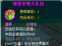玩家累计使用6个中级坐骑进阶丹进阶坐骑,系统将额外奖励1个中级坐骑进阶丹;
