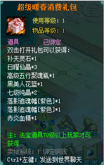 | 消费满4888元宝 | 中型暖春消费礼包 | 活动时间,只能领取一次 |