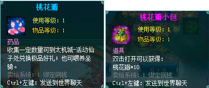 【活动内容】:活动期间,玩家可凑齐足够数量的桃花瓣去太机城—活动仙子处兑换各类珍贵道具。