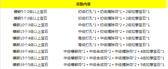 活动内容:镶嵌宝石可以大幅提高玩家战斗力,玩家拥有更多宝石时可以把宝石无损拆除出来合成更高级的宝石。在活动时间内达到指定宝石镶嵌目标的玩家可以获得丰厚奖励。