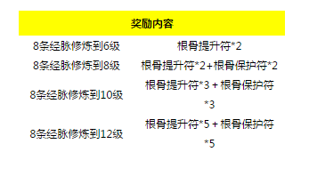 活动内容:经脉为玩家前期提高战斗力的捷径,将所有经脉修炼到8级,12级,16级还可以获得额外的属性。经脉配合根骨一起提升可以获得更好的效果。在活动时间内达到指定经脉提升目标的玩家可以获得丰厚奖励。