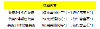 活动内容:紫色装备为前期最好的装备,拥有紫色装备可以助您横扫副本。紫装可以通过进阶、熔炼、精炼进一步打造为更极品装备!在活动时间内收集并装备指定数量紫色装备的玩家可以获得丰厚奖励。
