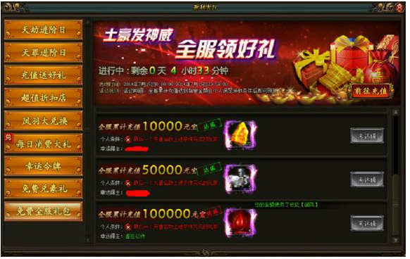 土豪发神威,全服领好礼活动创世来袭,凡全服累计充值达到一定数额,玩家个人满足一定的条件即可领取各种超值大礼