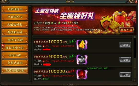 土豪发神威,全服领好礼活动创世来袭,凡全服累计充值达到一定数额,玩家个人满足一定的条件即可领取各种超值大礼