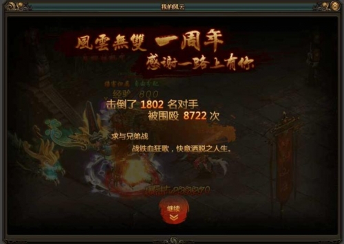 《风云无双》一周年,感谢一路上有你,感谢你的一小步,成就风云一周年,想不想知道你是什么时候第一次接触风云,在风云江湖中闯荡了多少时日,击杀过多少敌人,参加过多少次城战呢?凤云大数据展示可以让你回味去年,展望未来,还可领取丰厚礼包哦。