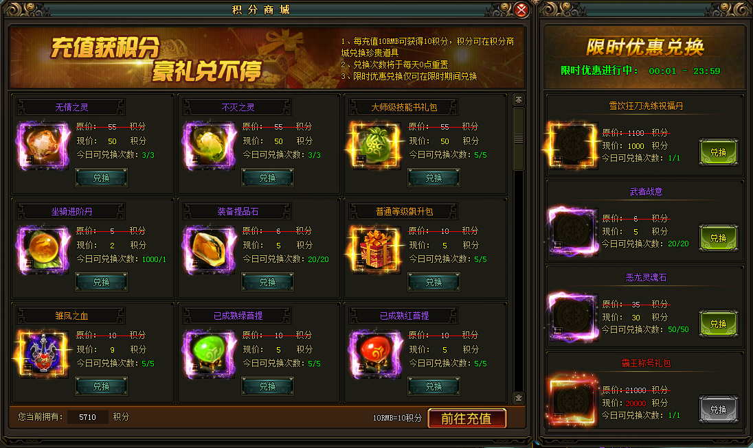 玩家每进行充值10RMB就会获得10积分,积分可在积分商城处兑换道具,更有限时优惠兑换,会上架一些超值的道具供玩家限时兑换