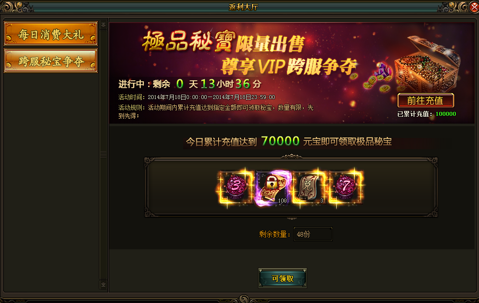【活动内容】:活动期间充值达到一定数额即可领取极品秘宝,