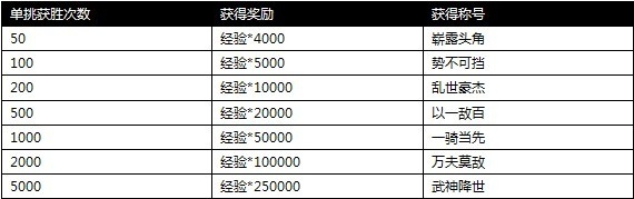 活动内容:单挑次数达到一定数量即可获得海量经验,还可获得万人景仰的称号