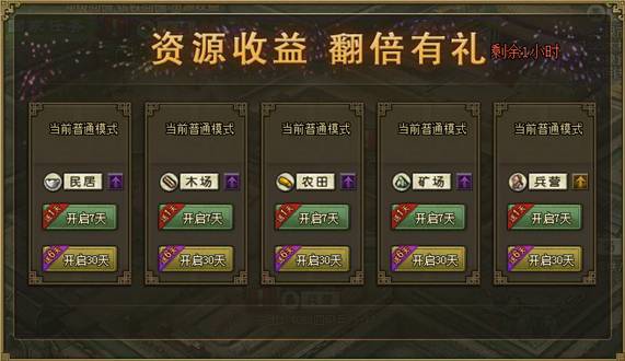 活动内容:活动期间,直接开启任意资源区3倍收益(兵营区为2倍)模式,达到以下要求,即可领取同倍收益的资源令奖励。多开多送!