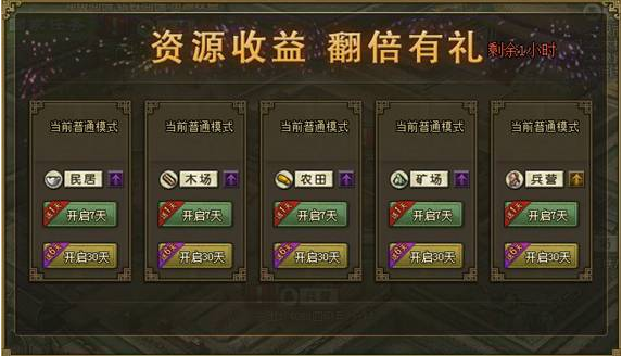 活动内容:活动期间,直接开启任意资源区3倍收益(兵营区为2倍)模式,达到以下要求,即可领取同倍收益的资源令奖励。多开多送!