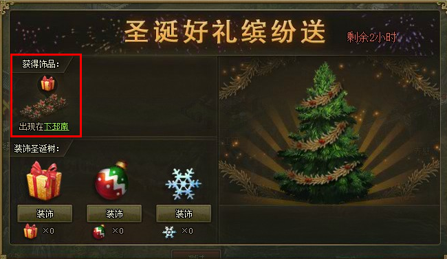 活动内容:活动期间,玩家通过收集“礼盒”、“彩球”和“雪花”三样圣诞装饰品道具,去装扮圣诞树。装扮共分三层,装扮满一层获得一份奖励,全部装扮可以摇圣诞树,获得圣诞大礼包奖励。