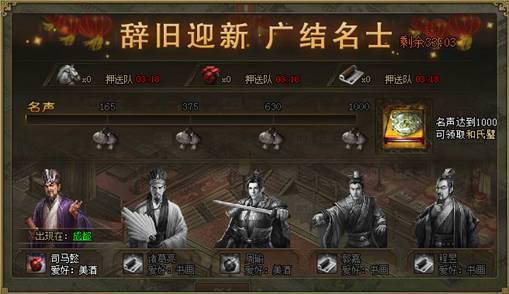 辞旧迎新,普天同庆!2014年元旦之际,三国名士游历世界,造访各地!在世界上截获“贵重品部队”,收集名士们的喜好品后去结交名士,就可获得名声和经验、粮食、镔铁等好礼。当名满天下之时,更可获得稀世珍宝“和氏璧”!
