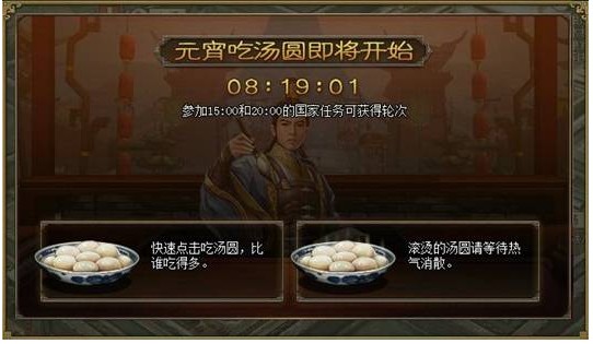 活动内容:活动期间,可在当天15点、20点参与两场国家任务进行汤圆制作,当天晚上21点45分进行吃汤圆小游戏,获得各类丰厚奖励。